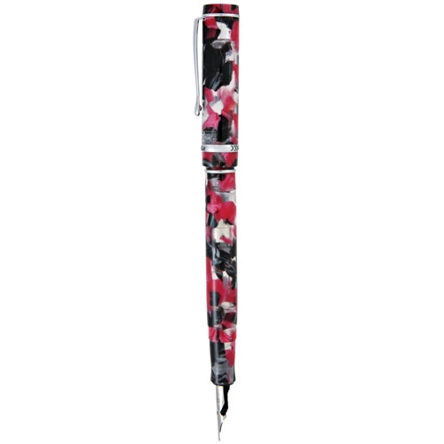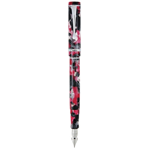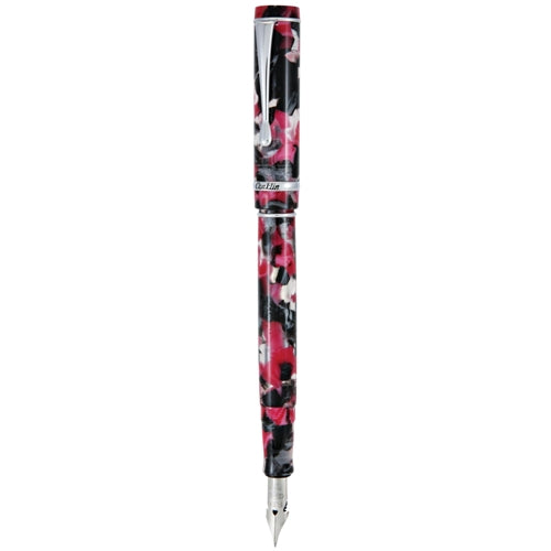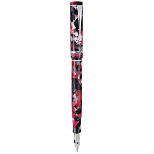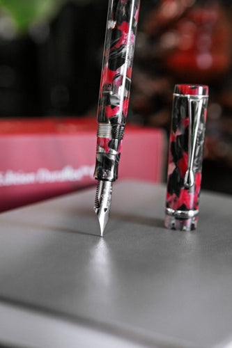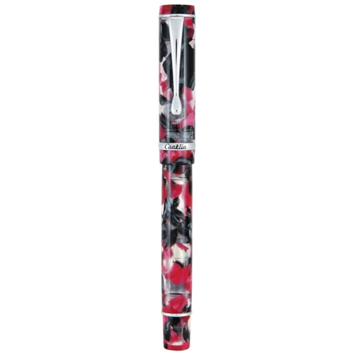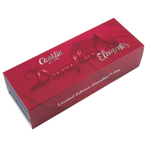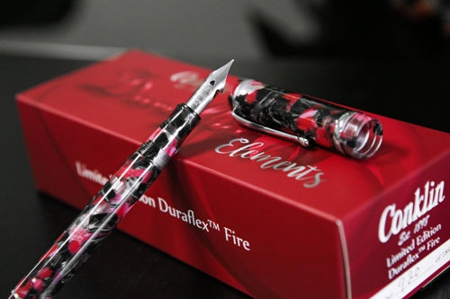 કોંકલિન ડ્યુરાફ્લેક્સ લિમિટેડ એડિશન ફાઉન્ટેન પેન પ્રકૃતિના તત્વોથી પ્રેરિત છે, આ નંબરવાળી, મર્યાદિત-આવૃત્તિની કોંકલિન પેન સમૃદ્ધ રંગો અને ક્લાસિક ડિઝાઇન ધરાવે છે. તેનું પારદર્શક રેઝિન બોડી લાલ અને કાળા રંગના મોટા ફ્લેક્સથી ઢંકાયેલું છે, જે આગના તત્વનું પ્રતિનિધિત્વ કરે છે. શરીર સિલ્વર-રંગીન ટ્રીમ અને મેચિંગ સ્ટીલ નિબ સાથે ઉચ્ચારણ છે.