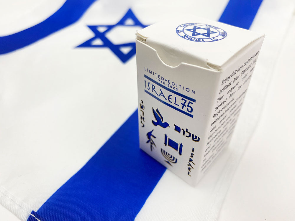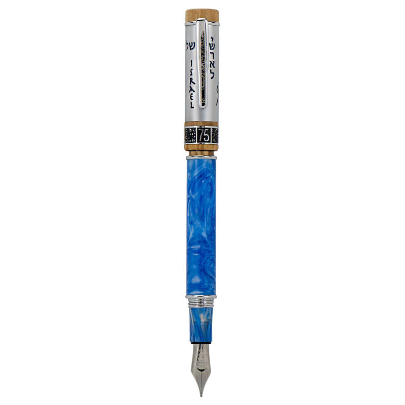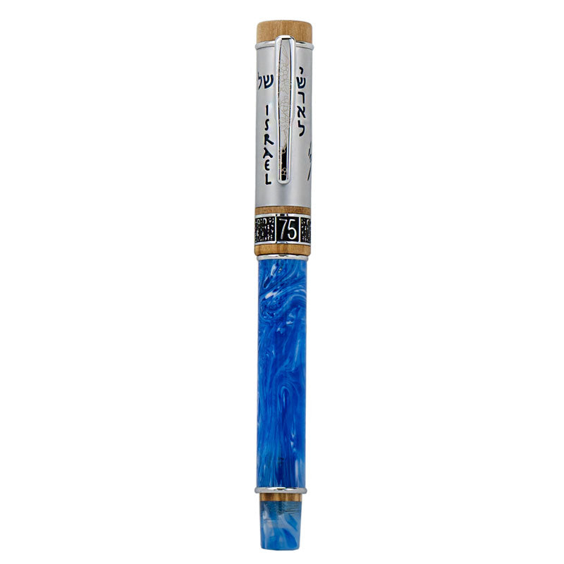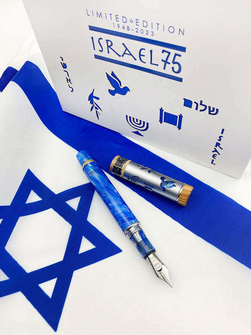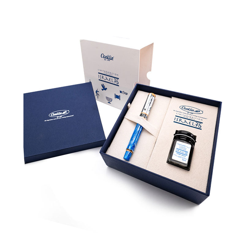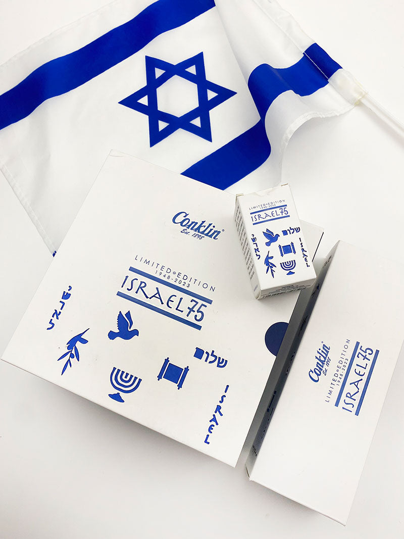 Conklin® ઇઝરાયેલ 75 એનિવર્સરી ડાયમંડ જ્યુબિલી (એક ખાસ વર્ષગાંઠની ઉજવણી) લિમિટેડ એડિશન 1948 કલેક્શન, વિન્ટેજ કોંકલિન ક્લાસિકની પુનઃજીવિત ડિઝાઇન, ફાઉન્ટેન પેન, રોલરબોલ અને બોલપોઇન્ટ કલેક્શન રજૂ કરવામાં ગર્વ અનુભવે છે. જોવામાં અપવાદરૂપ અને હાથમાં પણ વધુ સારું, ઇઝરાયેલ 75 એટલું જ અનોખું છે જેટલું તે અદભૂત છે. સંપૂર્ણતા માટે મશિન અને સાવચેતીપૂર્વક હાથથી પોલિશ્ડ, ઇઝરાયેલ 75 બોડીમાં એક પ્રકારનું ઉચ્ચ-ગ્રેડેડ વાદળી અને સફેદ રેઝિન, ઓલિવ વુડ છે, અને પછી ઓવરલે, ક્લિપ અને રિંગ્સ સાથે આકર્ષક ક્રોમ ઉચ્ચારોથી શણગારવામાં આવે છે. વિગતો પર ઝીણવટપૂર્વક ધ્યાન આપીને બનાવેલ, દરેક લેખન સાધન એ દેશનું દ્રશ્ય પ્રતિનિધિત્વ છે. સુંદર સાટિન ક્રોમ પ્લેટેડ ઓવરલે જેમાંથી એક ડિઝાઇન કોતરવામાં આવી છે. નીચે કસ્ટમ-મેડ રેઝિન ઇઝરાયેલના સાંસ્કૃતિક મૂલ્યોના મુખ્ય પ્રતીકો દર્શાવે છે: શબ્દો ઇઝરાયેલ અને (હિબ્રુમાં ઇઝરાયેલ); એક કબૂતર અને ઓલિવ શાખા, સમગ્ર વિશ્વમાં શાંતિના પ્રતીક તરીકે ઓળખાય છે; સાત-શાખાવાળી મેનોરાહ, સર્જનના સાત દિવસોનું પ્રતીક છે; હીબ્રુ શબ્દ શાલોમ, જેનો અર્થ થાય છે "શાંતિ" (સંવાદિતા અને સંતોષમાંથી એક, સંપૂર્ણ શાંતિમાં); તોરાહ, યહૂદી આધ્યાત્મિક અને ધાર્મિક પરંપરાના મુખ્ય ભાગને રજૂ કરે છે . ટોપીના ઓલિવ વૂડની ટોચ પર સ્થિત એક જટિલ કોતરણીવાળો સિક્કો છે જેમાં સ્ટાર ઓફ ડેવિડ શેમા ઇસ્રાએલ (દૈનિક સવાર અને સાંજની પ્રાર્થના સેવાઓનું કેન્દ્રસ્થાન) દ્વારા ઘેરાયેલું છે જે વાંચે છે.