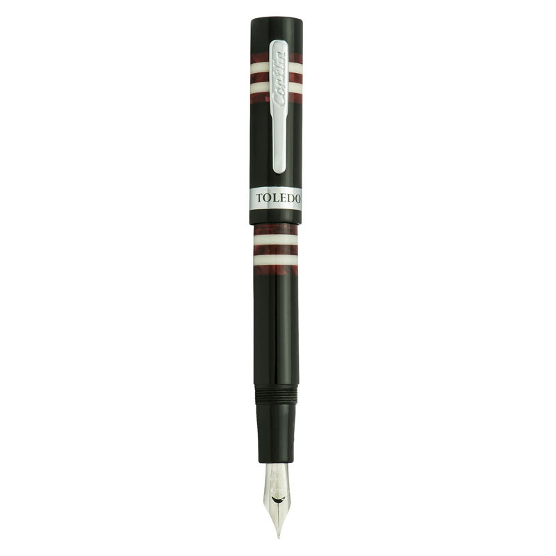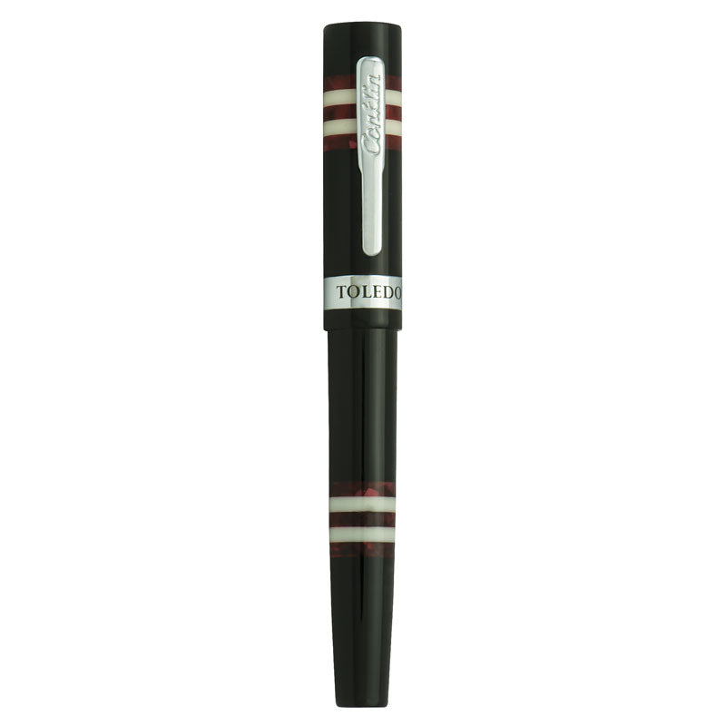 કોંકલિન ટોલેડો ફાઉન્ટેન પેન એ ક્લાસિક લક્ઝરી પેન ડિઝાઇન છે જે ઓહિયો (યુએસએ) રાજ્યના ચોથા સૌથી મોટા શહેર અને કોંકલિન પેન્સના જન્મસ્થળ દ્વારા પ્રેરિત છે. પ્રકાશનમાં બ્લેક રેઝિન કેપ અને બેરલ પર સ્પ્રિંગ લીવર કોંકલિન પેન ક્લિપ સાથે ઉચ્ચ ગુણવત્તાની સામગ્રી છે. થ્રેડેડ કેપ પોસ્ટ કરી શકાય તેવી છે. દરેક પેન આબેહૂબ રેઝિન અને સફેદ રેઝિન વચ્ચે વૈકલ્પિક રિંગ્સ સાથે વિવિધ રંગોમાં (તમારી રંગ પસંદગીના આધારે) શણગારાત્મક રિંગ્સની શ્રેણી દર્શાવે છે. પેન કલેક્શનનું નામ કેન્દ્રની રિંગ પર કોતરવામાં આવ્યું છે અને પેનની ક્લાસિક બ્લેક રેઝિન ક્રોમ ટ્રીમ દ્વારા ઉચ્ચારવામાં આવી છે.