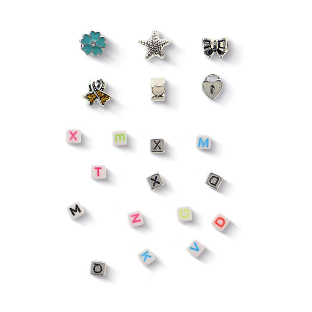 A5 Clipbook, 6 assorted ribbons (length 90 cm each), 60 assorted plastic beads, 6 assorted silver plated charms, 3 rolls of assorted washi tape (10 meters), 1 roll of glitter washi tape (7 meters), Inspiration leaflet