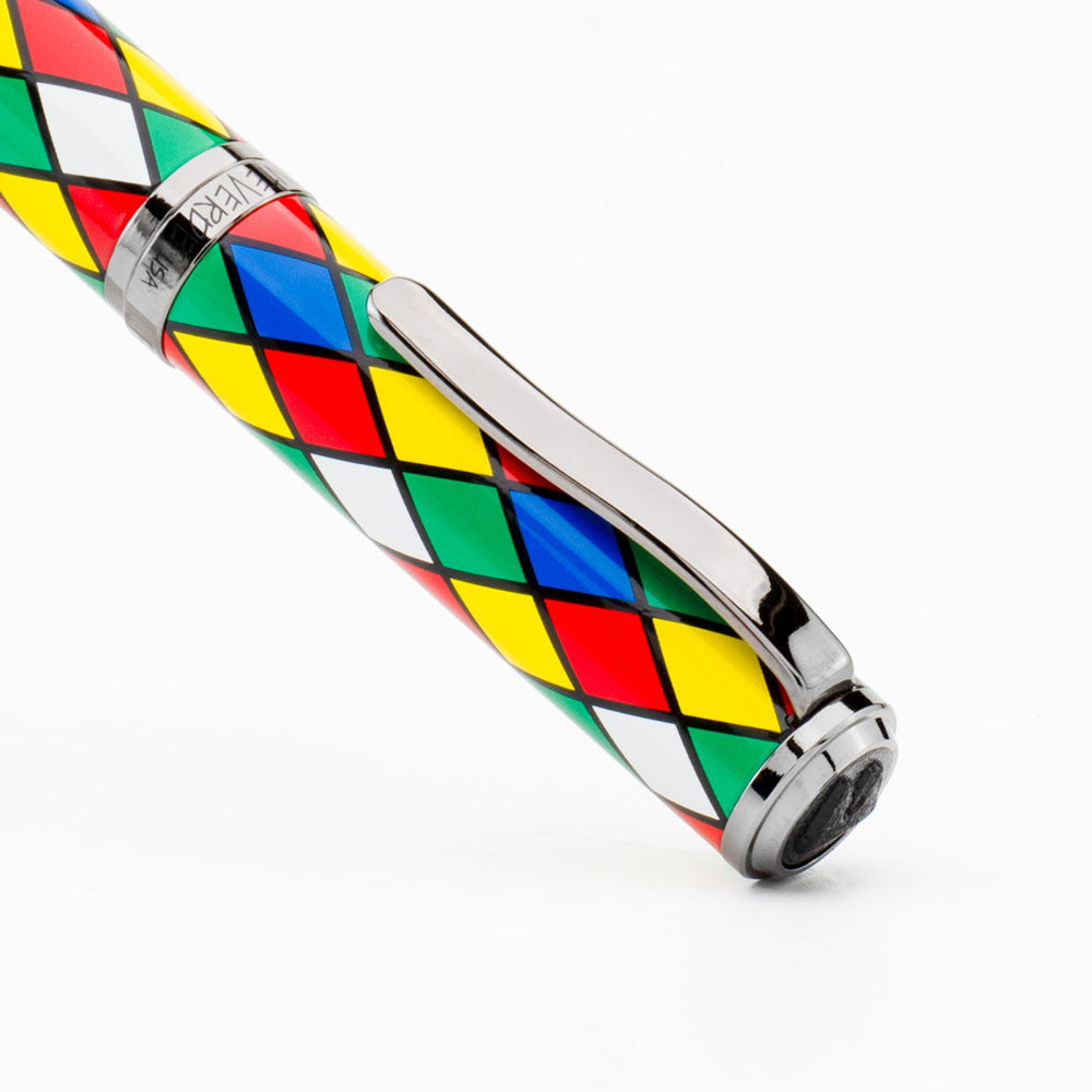 In the spirit of this rich tradition, the pen's design is a celebration of sharp lines and intricate patterns. The meticulously crafted yellow/blue/red/green/white and black harlequin motif adorns the pen's body and cap, creating a mesmerizing interplay of bright colors. The pen's sleek form is a tribute to the harlequin's legacy, embodying a sense of mystery and style.