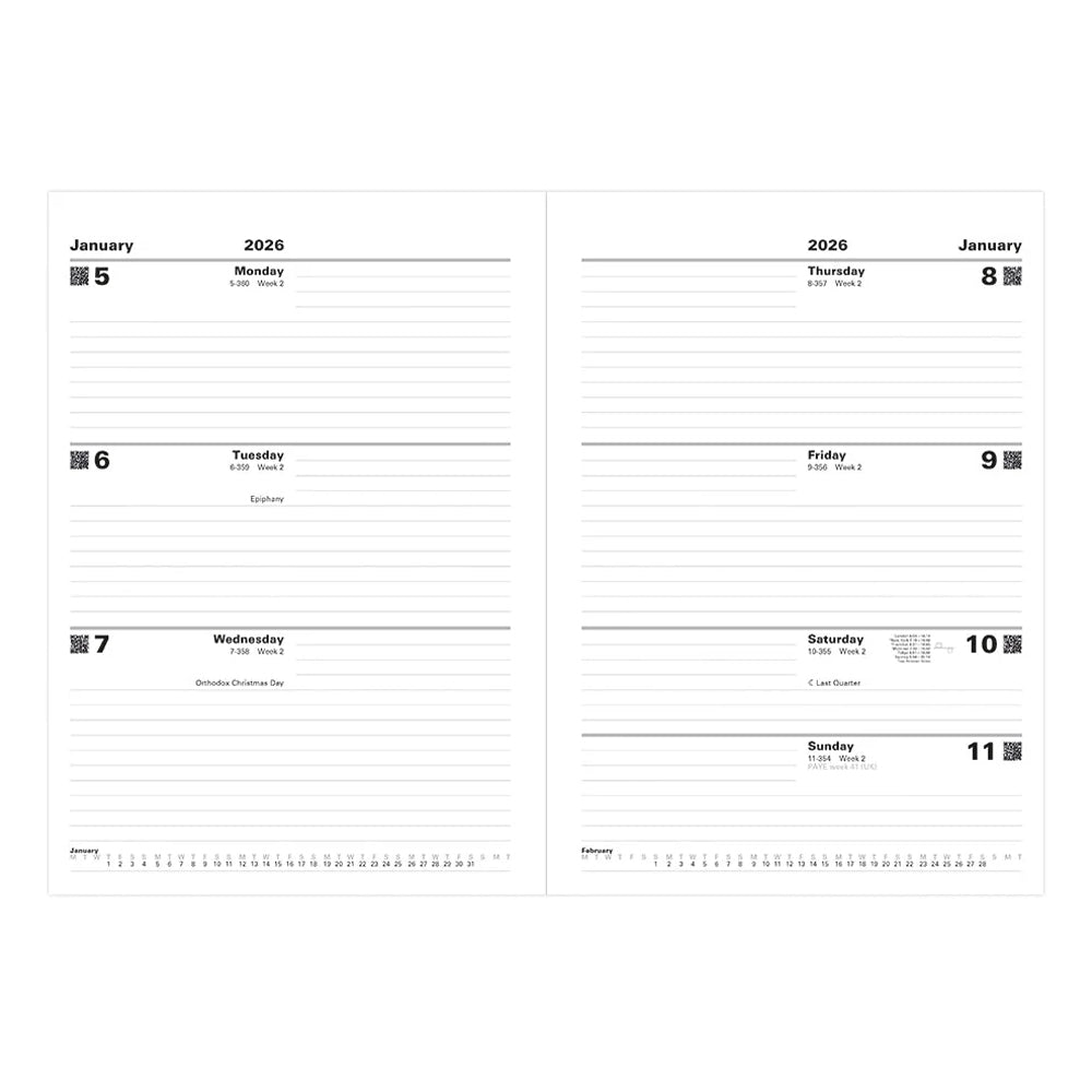અમારી ક્લાસિક હાર્ડબેક A4 ડાયરી 2023 ડેટ ફોઇલ એમ્બોસિંગ સાથે લક્ઝરી સ્મૂધ લેધર-લુક કવરમાં બનાવવામાં આવી છે. રિબન પેજ માર્કર અને ટકાઉ સોર્સ્ડ વ્હાઇટ પેપર દર્શાવે છે. ડાયરી લેઆઉટ જોવા માટે અંગ્રેજી સપ્તાહ. યુકેમાં બનાવેલ છે.
