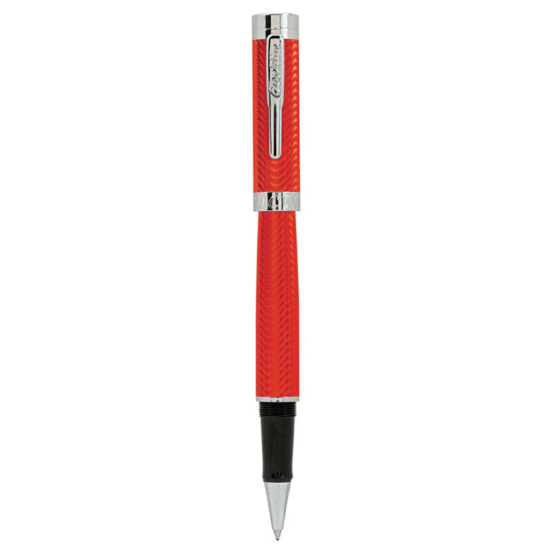 The new Herringbone Signature Collection combines vintage appeal with modern flair and elegance. The unique chase design is achieved by using a precise computerized engraving process to cut the intricate pattern into the solid metal barrel. The pen is then covered with a unique translucent colored lacquer and coated with several layers of epoxy resin for durability and striking color vibrance. The Herringbone Signature collection is available in four stunning colors with lustrous chrome accents: Blue, Red, Silver and Yellow. Each pen features Conklin’s original 1916 patented spring loaded rocker clip. The cap top is embellished with Conklin and Herringbone logos. The center ring is engraved with the Conklin “C” surrounded by four Conklin crescent shapes on each side.