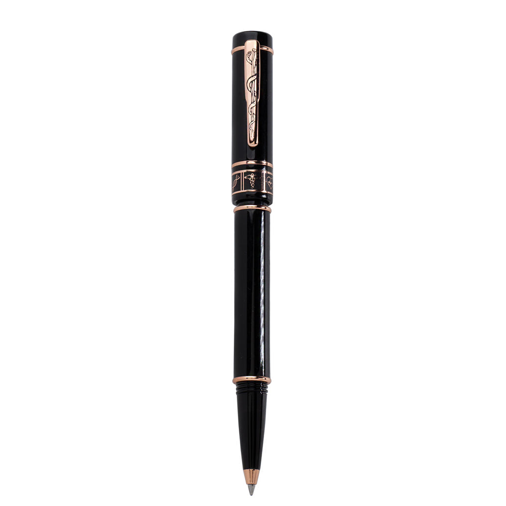 The collection features a European-grade, hand-crafted smooth resin. The glossy black body is adorned with 18KT gilded rose gold elements representing iconic medical symbols, including the stethoscope, Bowl of Hygeia, DNA string, Heartbeat sign, Caduceus, and the Star of Life. The top of the cap boasts an 18KT gilded rose gold coin depicting Hippocrates, while the clip showcases the renowned rod of Asclepius in 18KT gilded rose gold.