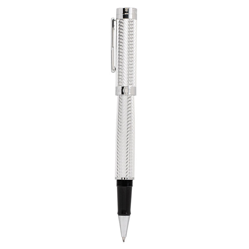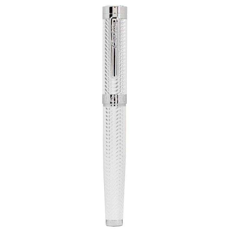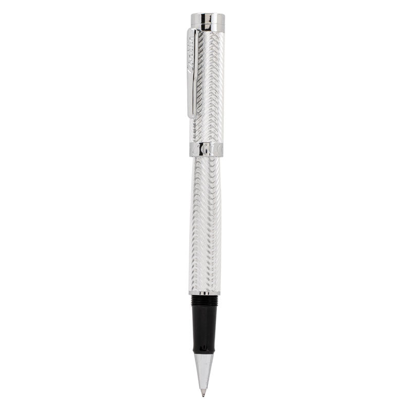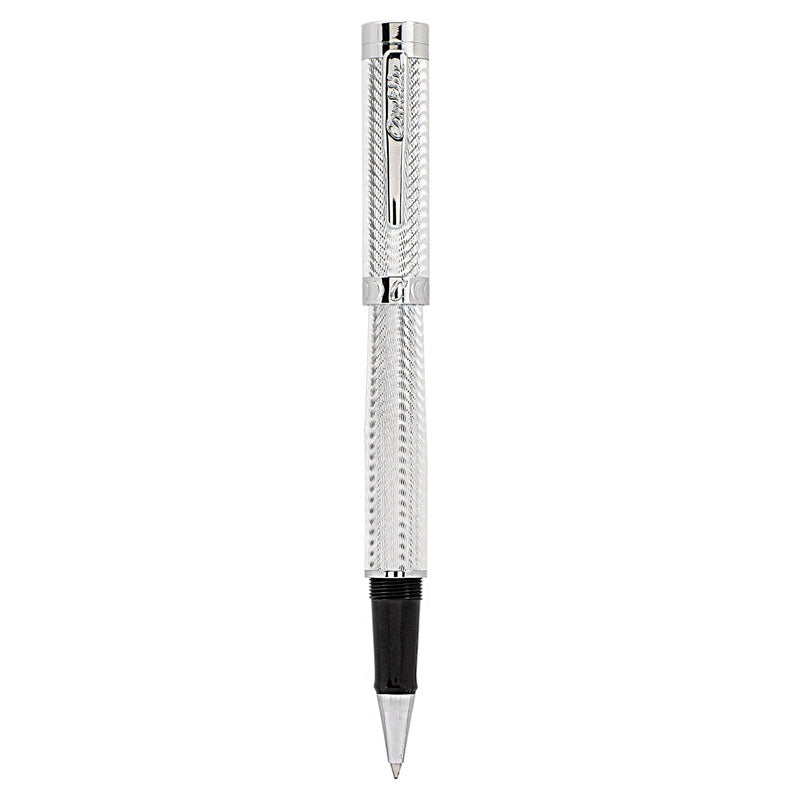 The Conklin USA New Herringbone Signature Collection combines vintage appeal with modern flair and elegance. The unique chase design is achieved by using a precise computerized engraving process to cut the intricate pattern into the solid metal barrel. The pen is then covered with a unique translucent colored lacquer and coated with several layers of epoxy resin for durability and striking color vibrance. The Herringbone Signature collection is available in four stunning colors with lustrous chrome accents: Blue, Red, Silver and Yellow. Each pen features Conklin’s original 1916 patented spring loaded rocker clip. The cap top is embellished with Conklin and Herringbone logos. The center ring is engraved with the Conklin “C” surrounded by four Conklin crescent shapes on each side.
